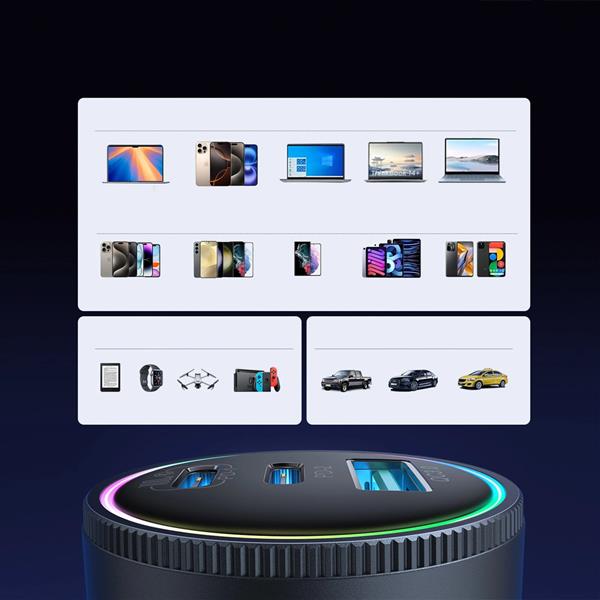 Joyroom JR-CCN07 to zaawansowana ładowarka samochodowa o łącznej mocy 145 W, która umożliwia szybkie ładowanie nawet trzech urządzeń jednocześnie. Wyposażona w dwa porty USB-C i jeden port USB-A, obsługuje najnowsze protokoły szybkiego ładowania PD 3.0, PPS, QC 4.0+, QC 3.0, AFC i FCP. Metaliczna obudowa o eleganckim, ciemnoszarym wykończeniu oraz inteligentny system rozpraszania ciepła zapewniają nie tylko stylowy wygląd, ale także długą i bezpieczną pracę. W zestawie znajduje się kabel USB-C o mocy 100 W, gotowy do obsługi najbardziej wymagających urządzeń mobilnych i laptopów.