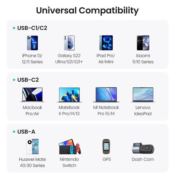 Jesteś użytkownikiem iPhone’a, Samsunga Galaxy, Huawei Mate, iPada, MacBooka, Mi Notebook Pro, Lenovo IdeaPad czy Nintendo Switch? Ładowarka samochodowa Ugreen CD293 jest gotowa sprostać Twoim potrzebom! Jej uniwersalność sprawia, że jest to idealne rozwiązanie dla każdego, kto ceni sobie efektywność.