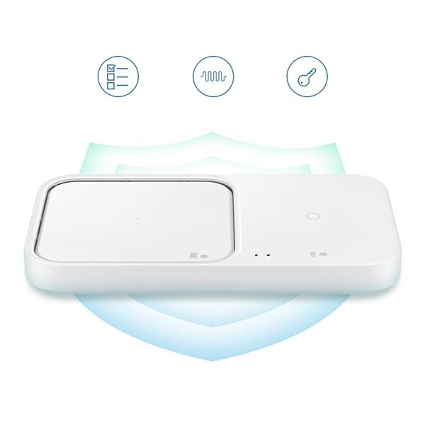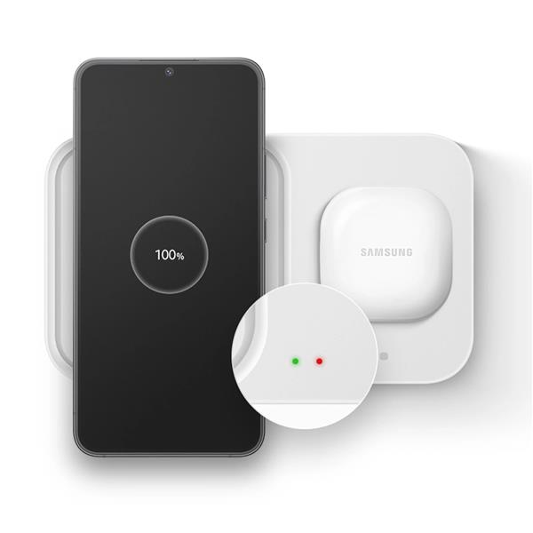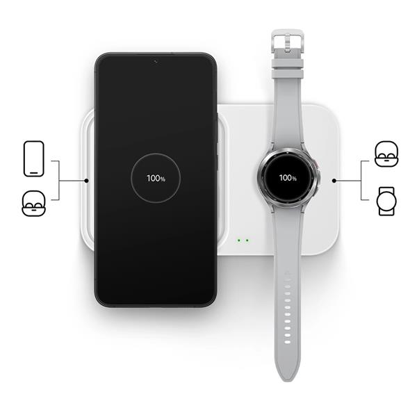 Ładowarka indukcyjna Samsung Wireless Charger Duo EP-P5400TWEGEU zapewnia szybkie ładowanie 15W – Twoje urządzenia będą gotowe do użycia w mgnieniu oka. Dzięki zgodności z adapterami podróżnymi i adaptacyjnemu szybkiemu ładowaniu bezproblemowo dopasuje się do podłączonych urządzeń.
