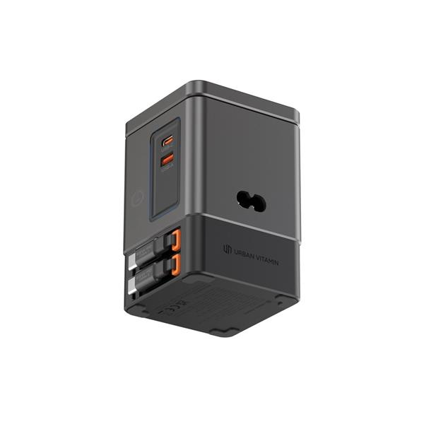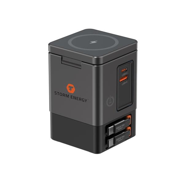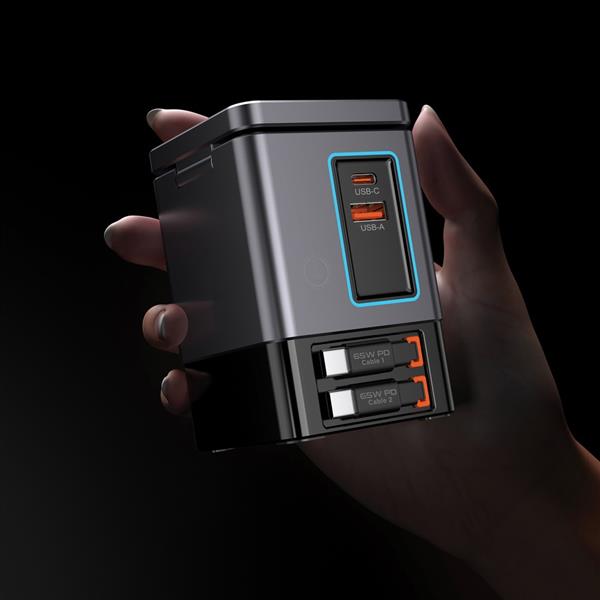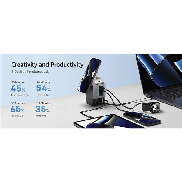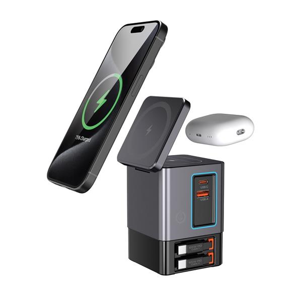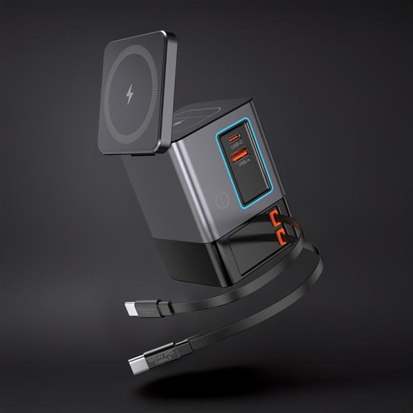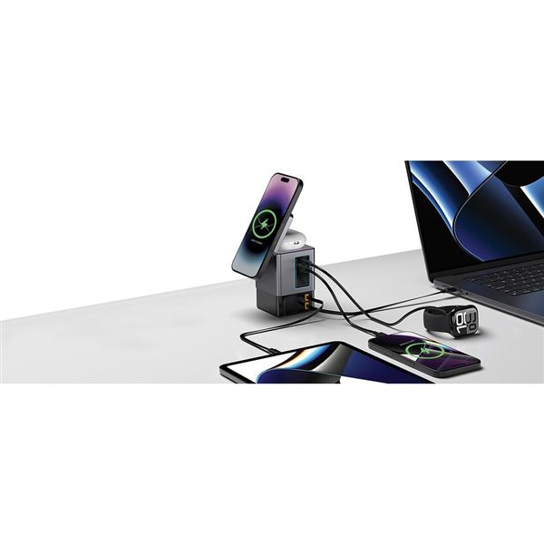 Ładowarka ścienna, stacja ładująca, moc ładowania do 105W, magnetyczna ładowarka bezprzewodowa 15W, dwa zintegrowane, zwijane kable USB-C, wyjście USB-C, wyjście USB, działa z telefonami posiadającymi możliwość ładowania indukcyjnego, wykonana z materiałów z recyklingu, całkowita zawartość materiałów z recyklingu obliczona na podstawie wagi całkowitej przedmiotu: 26%, kabel w komplecie