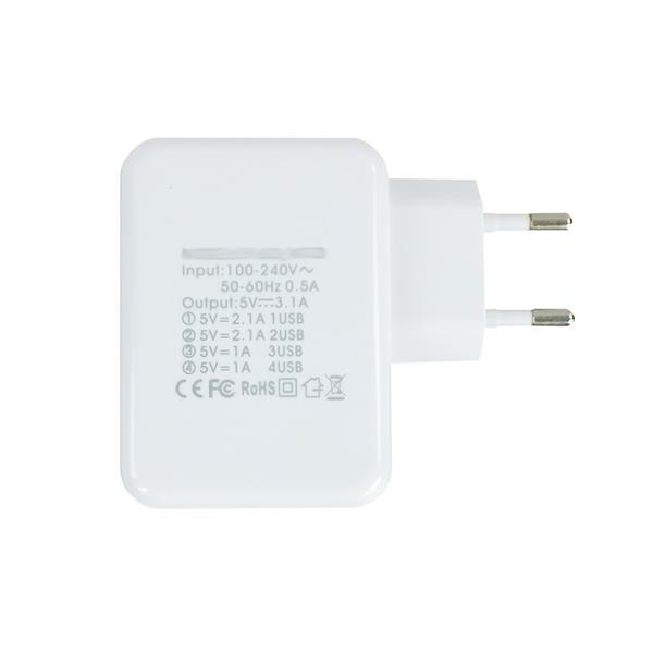 Ładowarka z 4 portami USB, całkowita moc urządzenia: 5V/3.1 A, wejście AC 100-240V, 50/60Hz 0.5A, wyjście 1: 5V/2.1A, wyjście 2: 5V/2.1A, wyjście 3: 5V/1A, wyjście 4: 5V/1A, maksymalna moc wyjściowa przy korzystaniu z jednego portu USB: 2.1A, możliwość ładowania czterech urządzeń jednocześnie