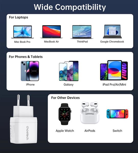 Ładowarka sieciowa Choetech PD6052 posiada dwa porty USB-C i umożliwia ładowanie smartfonu, tabletu lub słuchawek z mocą do 35 W. Pozwala ładować dwa urządzenia w jednym czasie. Technologia GaN sprawia, że proces ładowania jest efektywny i całkowicie bezpieczny. Wyraźny wyświetlacz informuje o mocy, z jaką działa ładowarka.