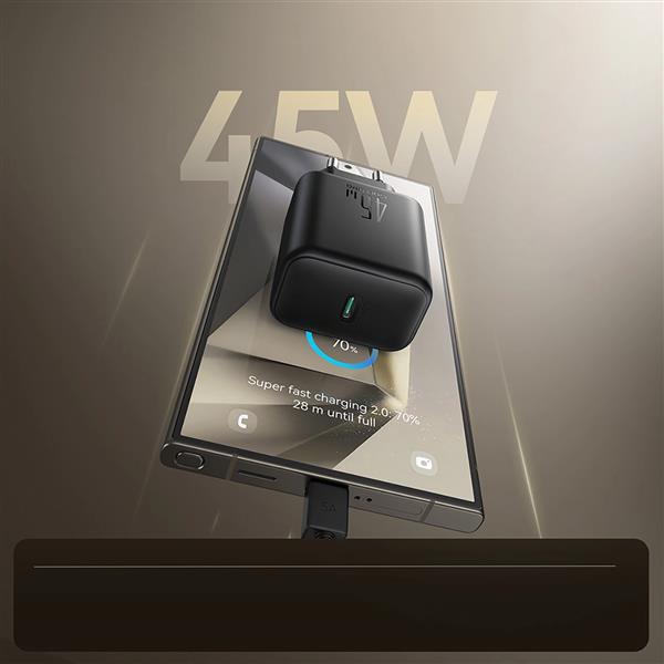 Ładowarka waży zaledwie 70.4 g i ma kompaktowe wymiary, co czyni ją idealnym wyborem do podróży lub pracy w biurze. Elegancki czarny design świetnie wpasowuje się w każde otoczenie.
