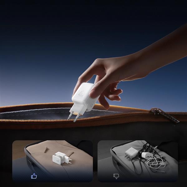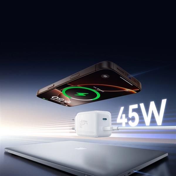 Zapewnia moc 45 W w kompaktowej obudowie, dzięki czemu ładowarka wygodnie mieści się w kieszeni lub organizerze.