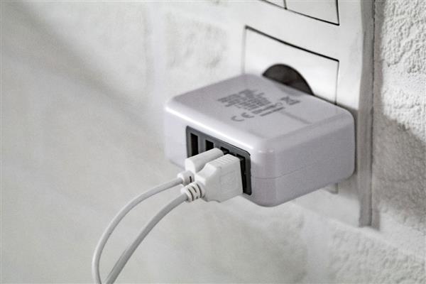 Plastikowa ładowarka USB z 4 portami, max moc wyjściowa 3100mA.