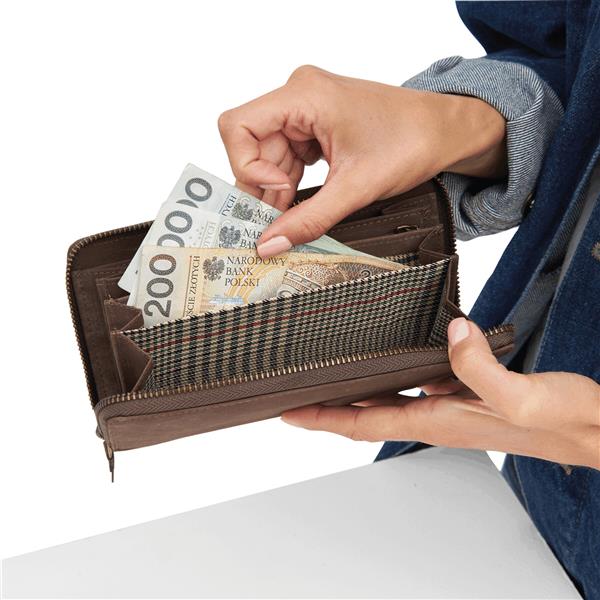 Portmonetka ze skóry naturalnej LADY z zamkiem błyskawicznym. 12 kieszonek na karty z osłoną RFID w celu ochrony przed niepożądanym skanowaniem, 3 kieszonki na banknoty, 1 kieszeń na monety z zamkiem błyskawicznym. Materiał: Skóra Kolor: brązowy Tagi: Portmonetki,portfele,portfele,skóra