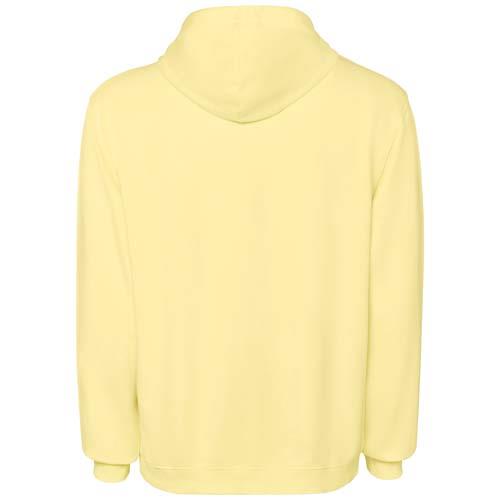 Bluza z kapturem typu unisex z wykończeniem wykończeniem uzyskanym dzięki poddaniu działaniu wybielacza w celu uzyskania smug lub odbarwień. Mankiety i talia wykończone prążkowanym ściągaczem 2×1. Kaptur podszyty dzianiną single dżersej w tym samym kolorze, z dopasowanymi płaskimi sznurkami. Ścieg kryty ton w ton przy dekolcie. Kieszeń kangurka.