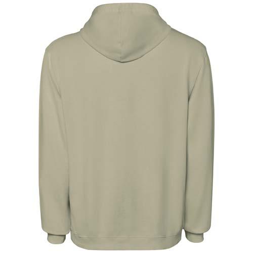 Bluza z kapturem typu unisex z wykończeniem wykończeniem uzyskanym dzięki poddaniu działaniu wybielacza w celu uzyskania smug lub odbarwień. Mankiety i talia wykończone prążkowanym ściągaczem 2×1. Kaptur podszyty dzianiną single dżersej w tym samym kolorze, z dopasowanymi płaskimi sznurkami. Ścieg kryty ton w ton przy dekolcie. Kieszeń kangurka.