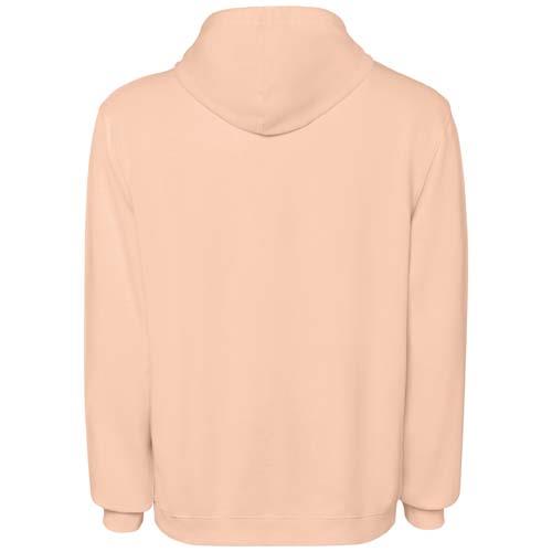 Bluza z kapturem typu unisex z wykończeniem wykończeniem uzyskanym dzięki poddaniu działaniu wybielacza w celu uzyskania smug lub odbarwień. Mankiety i talia wykończone prążkowanym ściągaczem 2×1. Kaptur podszyty dzianiną single dżersej w tym samym kolorze, z dopasowanymi płaskimi sznurkami. Ścieg kryty ton w ton przy dekolcie. Kieszeń kangurka.