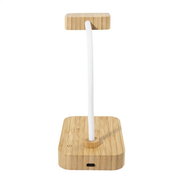 Wielofunkcyjna bambusowa lampka biurkowa z 12 diodami LED i wbudowaną szybką ładowarką bezprzewodową (15 W). Z ciepłym, naturalnym i chłodnym trybem światła oraz regulacją jasności. W zestawie kabel USB do ładowania.
