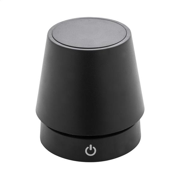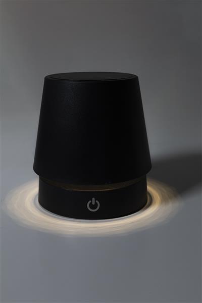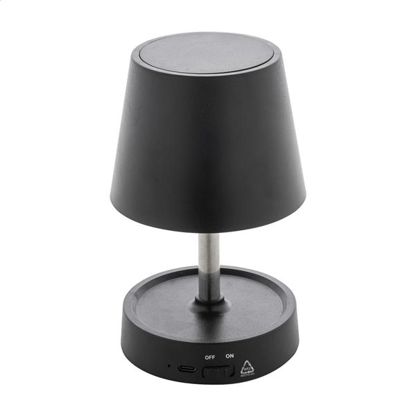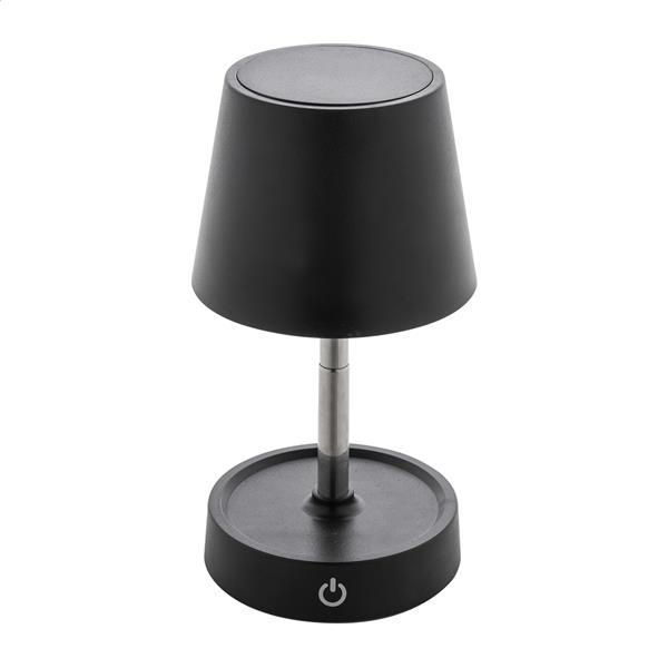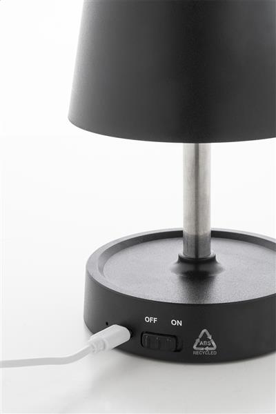 Teleskopowa lampa stołowa z recyklingowanego ABS z 12 diodami LED, regulowaną jasnością i akumulatorem USB o pojemności 1200 mAh. W zestawie kabel USB do ładowania.