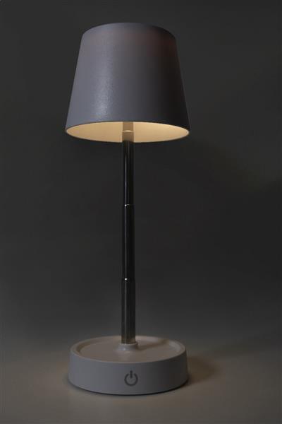 Teleskopowa lampa stołowa z prętem, wykonana z recyklingowanego ABS, z 12 diodami LED, regulowaną jasnością i akumulatorem USB o pojemności 1200 mAh. W zestawie kabel USB do ładowania.