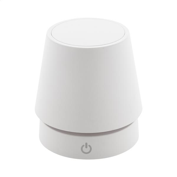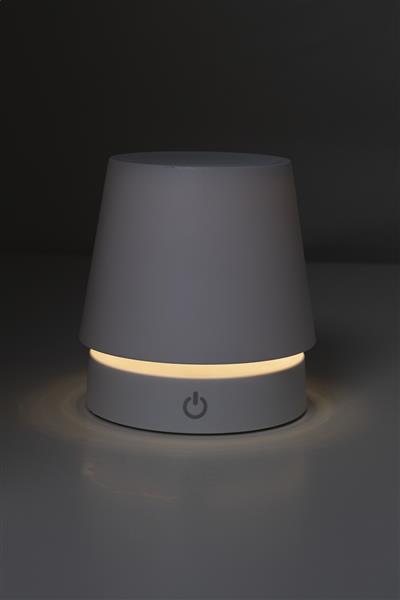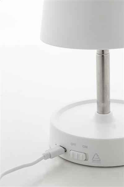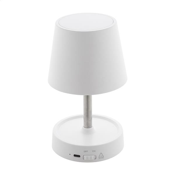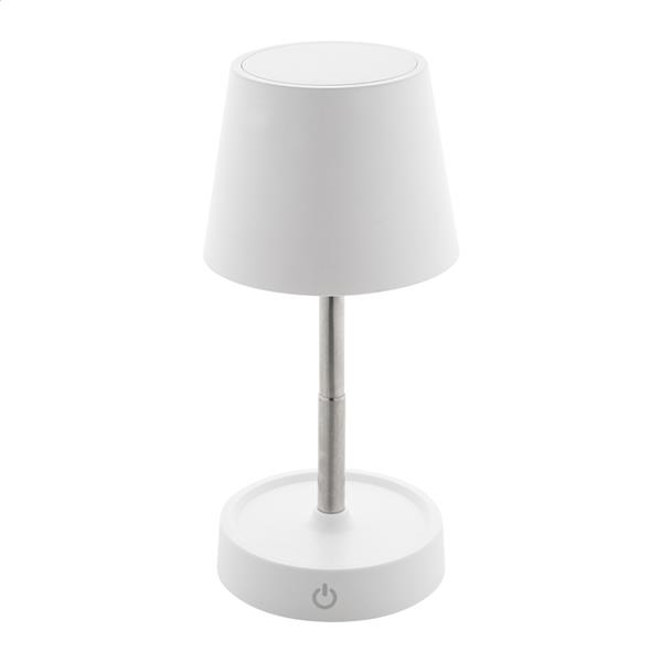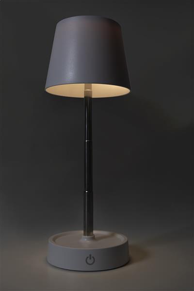 Teleskopowa lampa stołowa z recyklingowanego ABS z 12 diodami LED, regulowaną jasnością i akumulatorem USB o pojemności 1200 mAh. W zestawie kabel USB do ładowania.