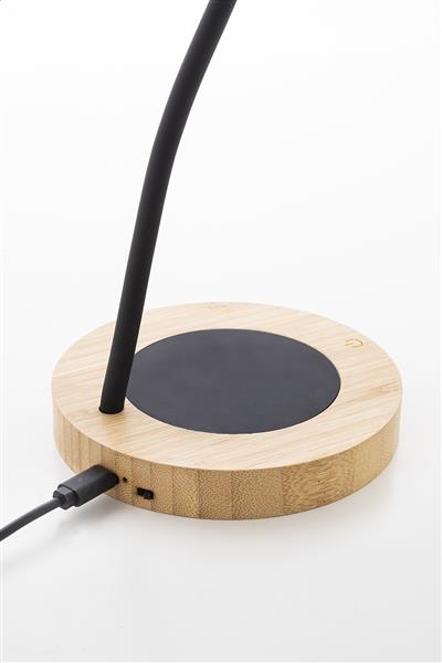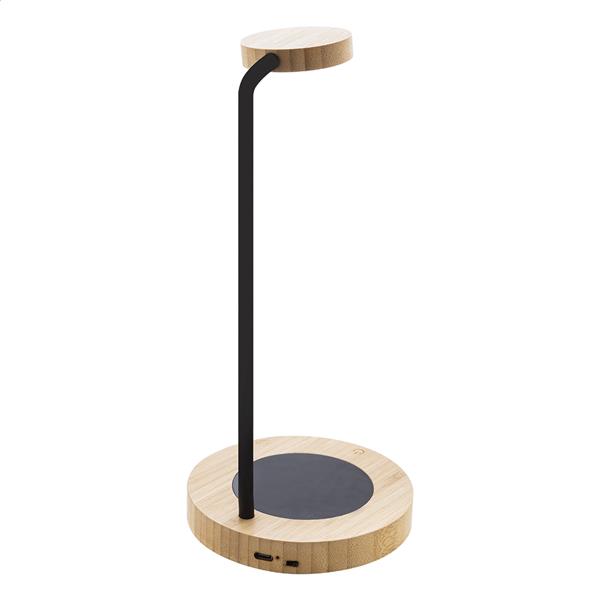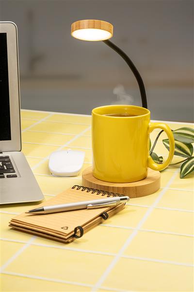 Wielofunkcyjna bambusowa lampka biurkowa z wbudowanym podgrzewaczem do kubków. Z ciepłym, naturalnym i chłodnym trybem światła. W zestawie kabel USB do ładowania.