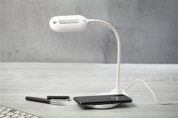 Wielofunkcyjna lampka biurkowa z ABS z recyklingu z wbudowaną indukcyjną szybką ładowarką (15W). Z 10 diodami LED, przyciskiem dotykowym i regulowaną jasnością. Zawiera kabel USB.