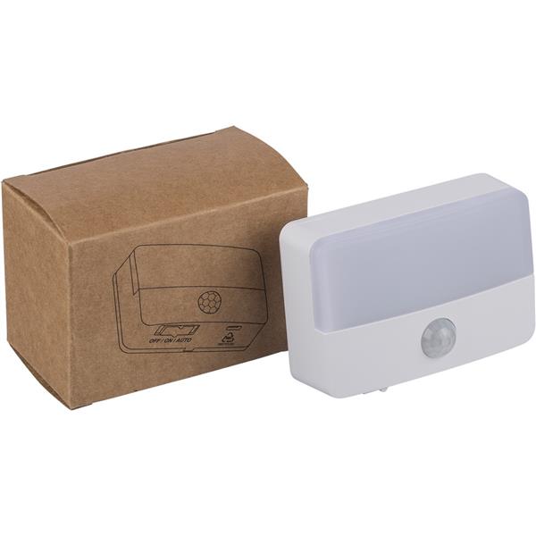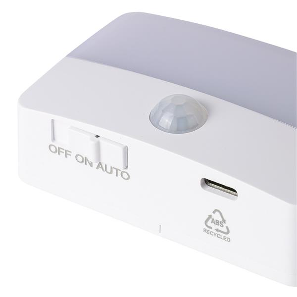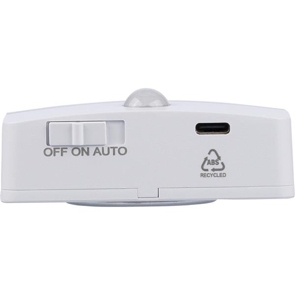 Lampka sensoryczna 30 lm, ładowana bateria 500 mAh, magnes, taśma samoprzylepna z tyłu, odległość wykrywania: 3-6m, kąt: 120 stopni, ikona ABS na spodzie produktu, port USB-C, pakowana osobno w brązowy kartonik, produkt wykonany z ABS z recyklingu