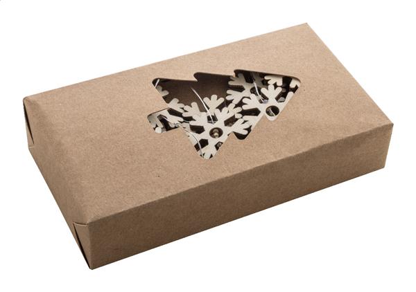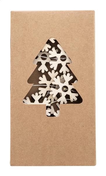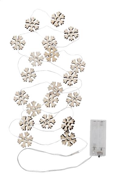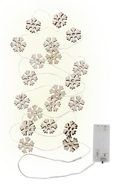 Świąteczny łańcuch świetlny z 20 lampkami LED w kształcie płatka śniegu. Działa na 2 baterie AA, bez baterii. Z przyciskiem ON/OFF na obudowie baterii. W pudełku z papieru pakowego.