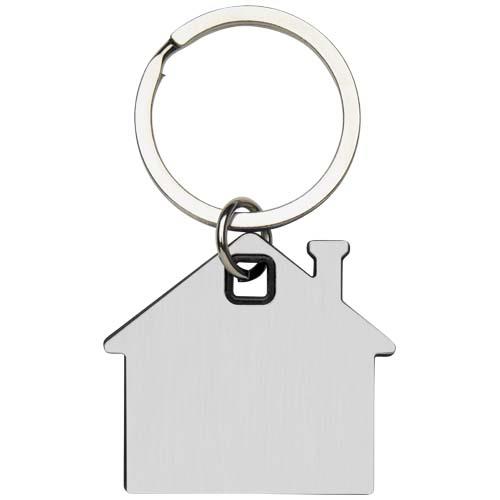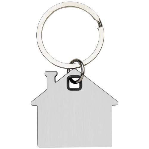 Łańcuszek do kluczy z brelokiem w kształcie domu, z płytką ze stali nierdzewnej o szczotkowanej strukturze z przodu i z tyłu oraz z kolorowym plastikowym elementem pośrodku.