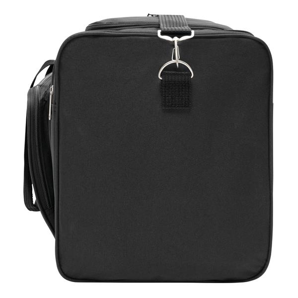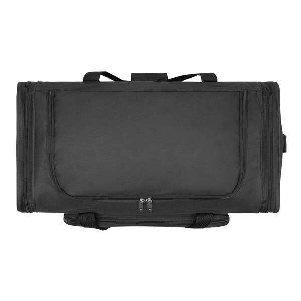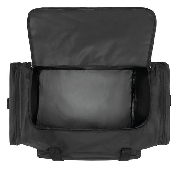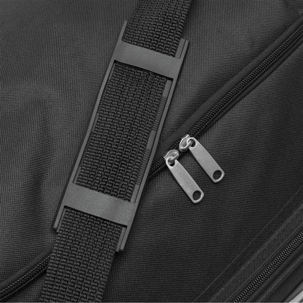 Torba podróżna LASER PLUS TRAV, główna komora na zamek błyskawiczny, przednia i boczna kieszeń na zamek, z wymienialnym metalowym emblematem, 2 tylnymi kieszeniami na zamek, zawiera regulowany i odpinany pasek na ramię.