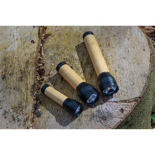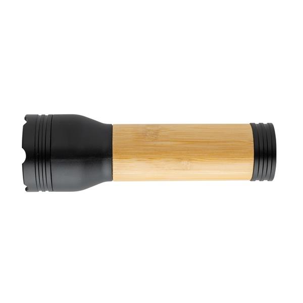 Latarka 3W, zasięg do 100 m, jasność 120 lm, 3 tryby świecenia, wbudowany akumulator o pojemności 1200 mAh pozwala na świecenie do 4,5 godzin, ponowne naładowanie w 2,5 godziny, wykonana z ABS z recyklingu z certyfikatem RCS oraz bambusa, całkowita zawartość materiałów z recyklingu obliczona na podstawie wagi całkowitej przedmiotu: 20%, wejście USB C, kabel z TPE z recyklingu z certyfikatem RCS w komplecie, w pudełku z papieru kraftowego