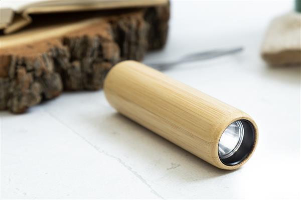 Latarka bambusowa z wbudowaną baterią ładowalną przez USB (320 mAh), 1 diodą LED i paskiem do noszenia. Z 3 trybami świecenia. W zestawie kabel do ładowania przez USB.