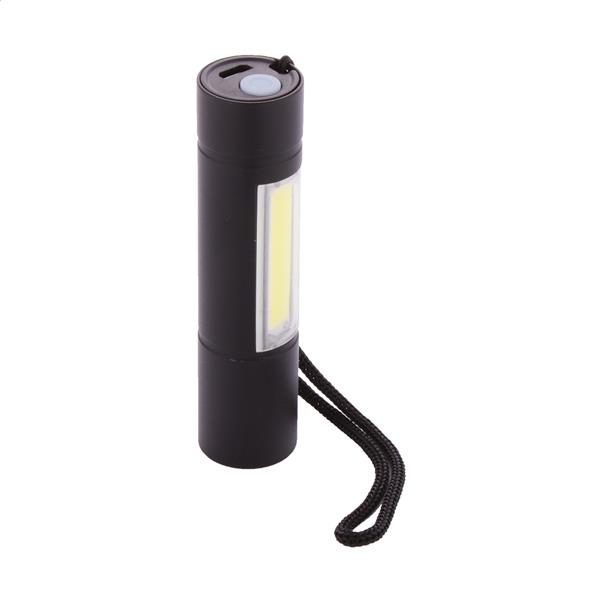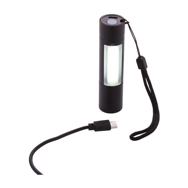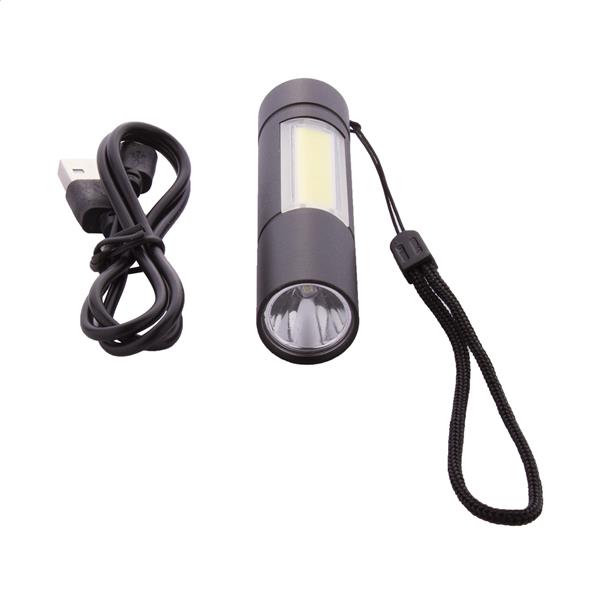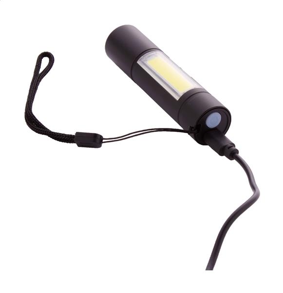Aluminiowa latarka z wbudowanym akumulatorem USB (400 mAh) i paskiem do noszenia. Ze światłem COB o dużej mocy i reflektorem COB z boku. Z trybami światła stałego i migającego. W zestawie kabel do ładowarki USB.