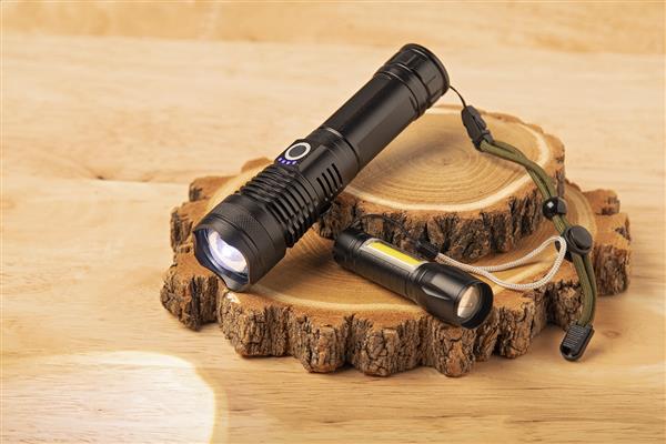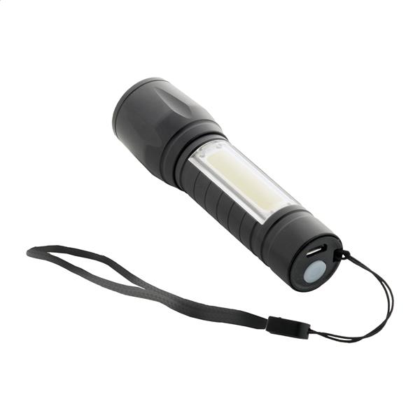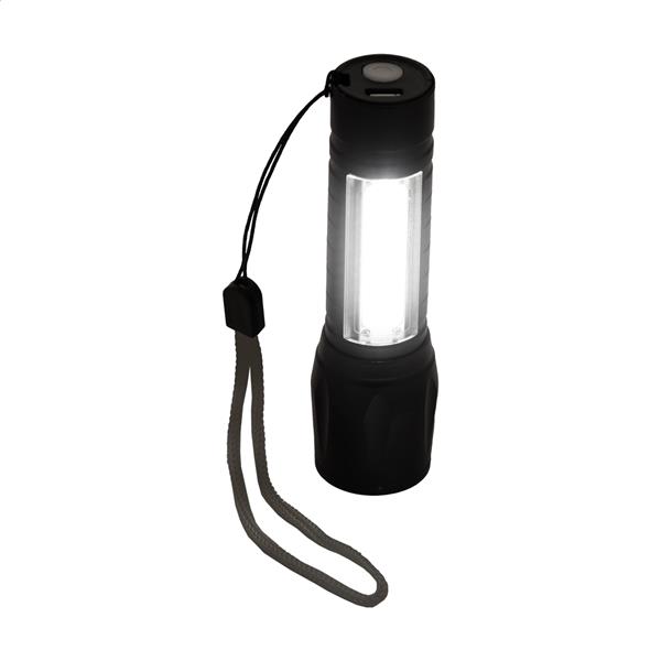 Aluminiowa latarka z wbudowanym akumulatorem USB (400 mAh) i paskiem do noszenia. Ze światłem COB o dużej mocy z możliwością powiększania przy czcionce i reflektorem COB z boku. Z trybami światła stałego i migającego. W zestawie kabel do ładowarki USB.