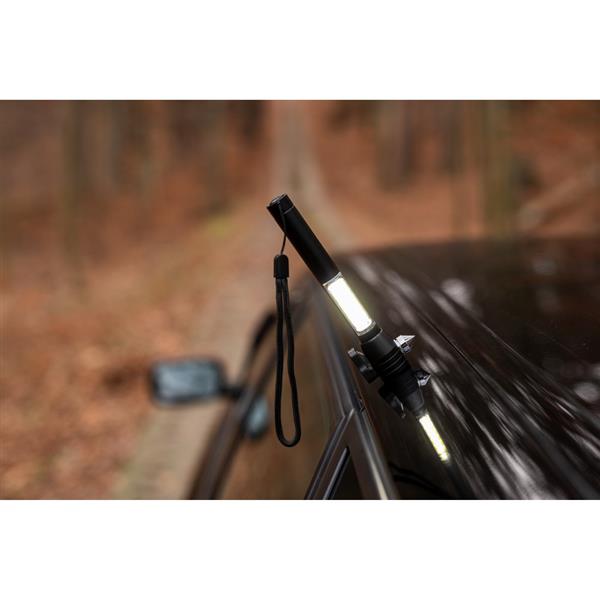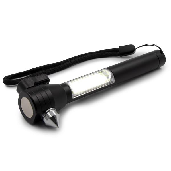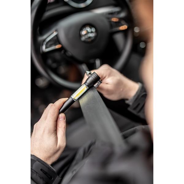 Latarka bezpieczeństwa ze światłem 1 LED COB o mocy 100 lumenów, posiada magnes umożliwiający przyczepienie, przecinak do pasów bezpieczeństwa oraz młotek bezpieczeństwa, w komplecie uchwyt ułatwiający noszenie, produkt wykonany z metalu