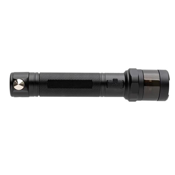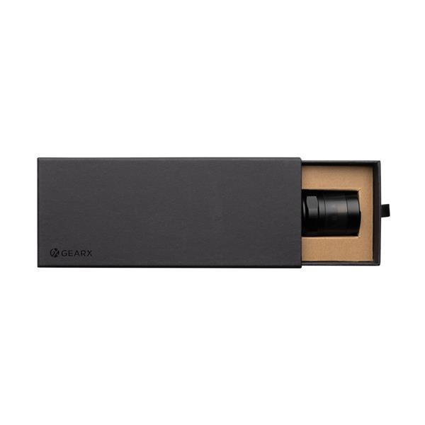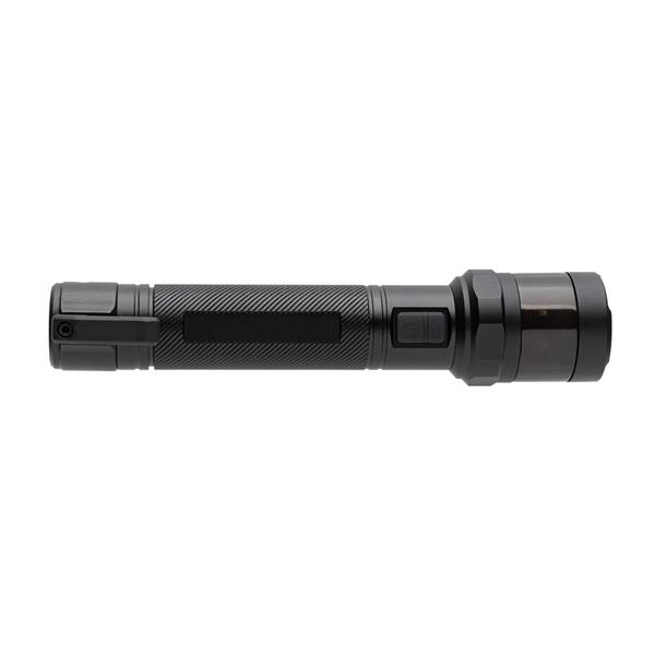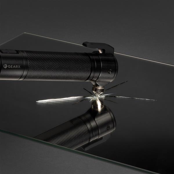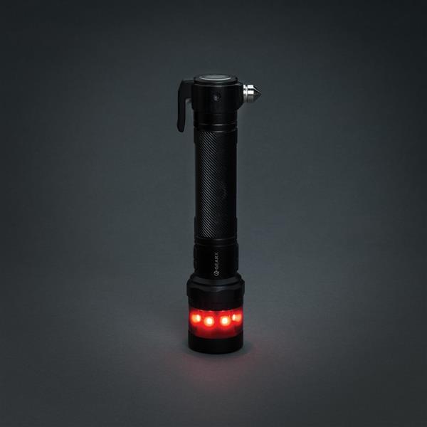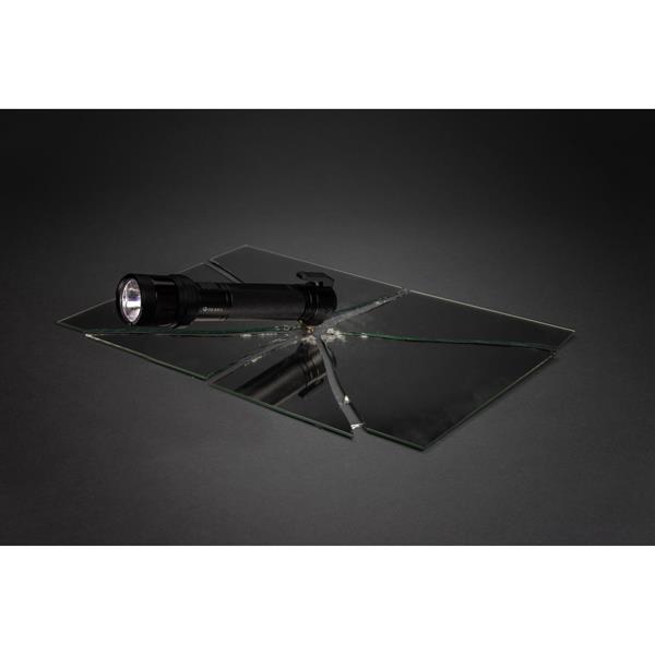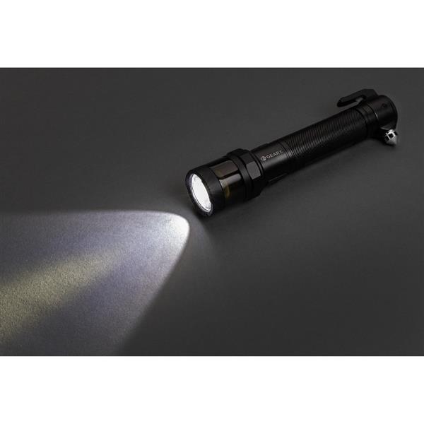 Latarka bezpieczeństwa LED, przecinak do pasów, młotek, jasność światła 500 lumenów, zasięg wiązki do 100 metrów, wykonana z materiałów z recyklingu, całkowita zawartość materiałów z recyklingu obliczona na podstawie wagi całkowitej przedmiotu: 59%, wbudowana bateria 2000 mAh, 3 tryby świecenia, wejście USB typu C, czas świecenia na jednym ładowaniu do 3 godzin, ślad węglowy produktu: 0 kg CO2