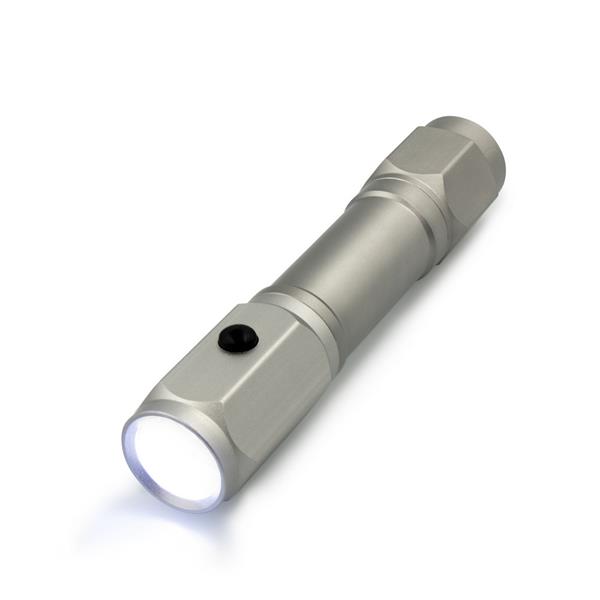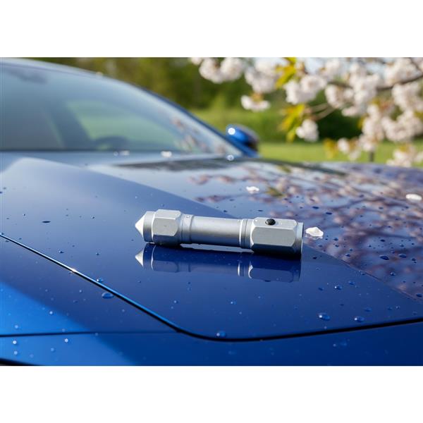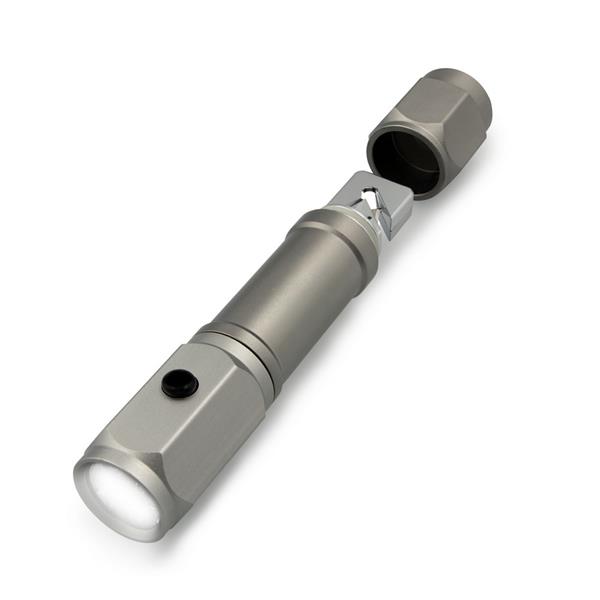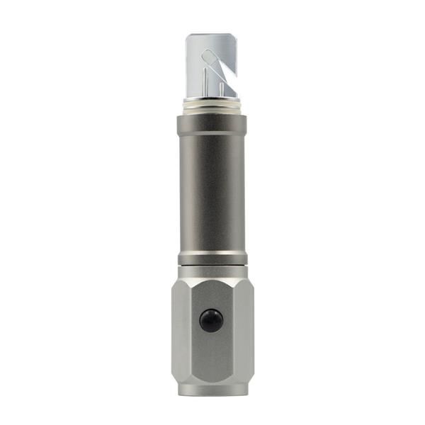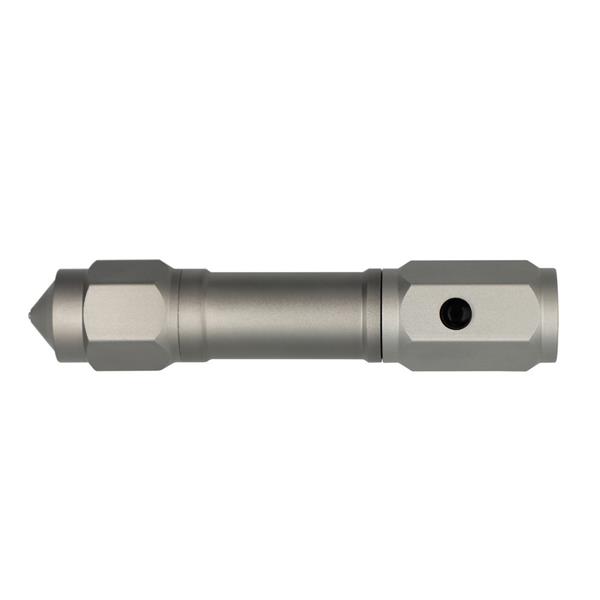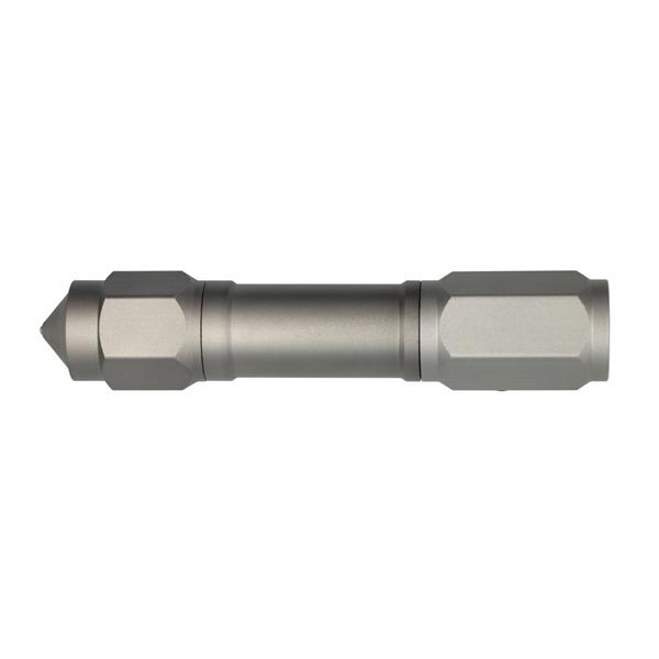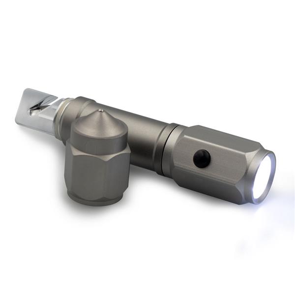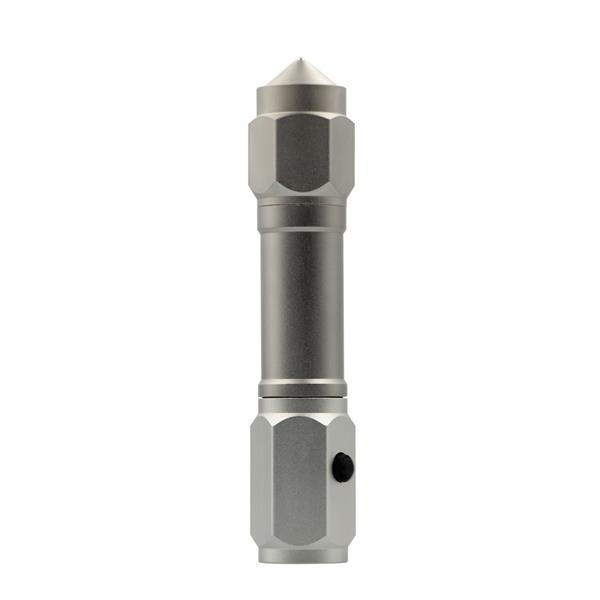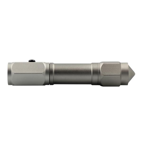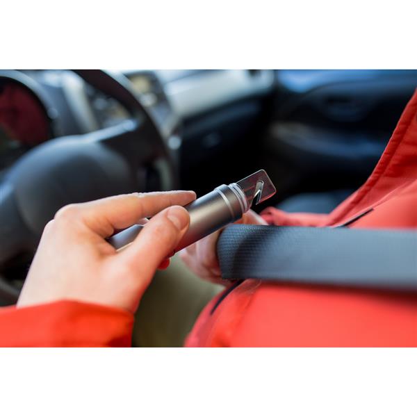 Latarka bezpieczeństwa o mocy 60 lumenów, posiada młotek bezpieczeństwa oraz przecinak do pasów bezpieczeństwa, produkt wykonany z aluminium