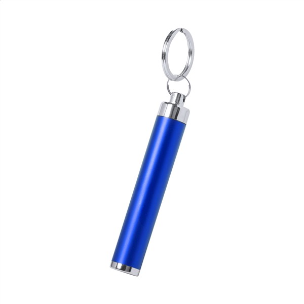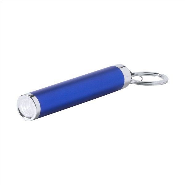 Plastikowa latarka z 1 LED i metalowym brelokiem. Logo grawerowane na korpusie jest podświetlone. W zestawie znajdują się baterie guzikowe.