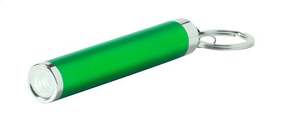 Plastikowa latarka z 1 LED i metalowym brelokiem. Logo grawerowane na korpusie jest podświetlone. W zestawie znajdują się baterie guzikowe.