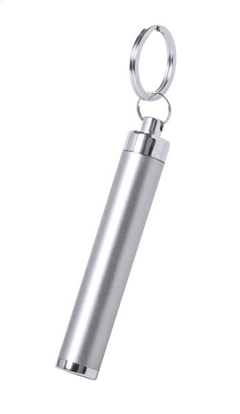 Plastikowa latarka z 1 LED i metalowym brelokiem. Logo grawerowane na korpusie jest podświetlone. W zestawie znajdują się baterie guzikowe.