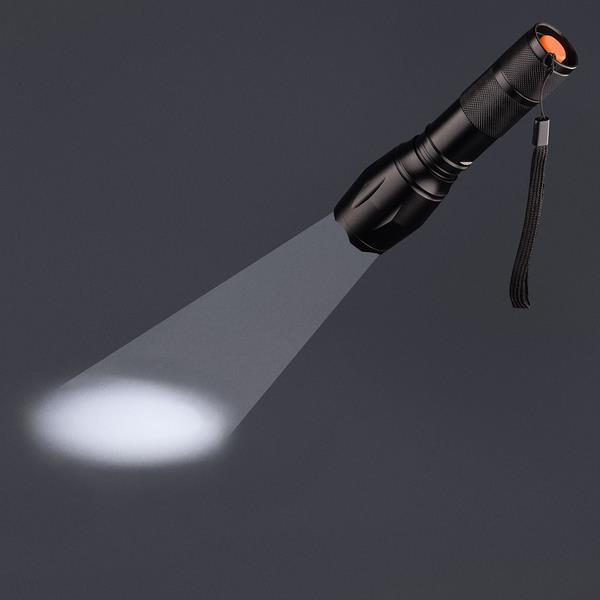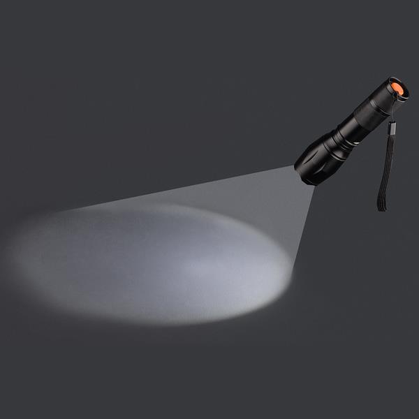 Latarka LED o strumieniu światła 250 lumenów i zasięgu 50 metrów. Wyposażona w diodę LED (5 W). Trzy tryby świecenia: mocny, oszczędzający, migający. Funkcja zoom. Pakowana w czarne etui z poliestru. Zasilana 3 bateriami typu AAA (dołączone). Żywotność LED – 100 000 godzin.