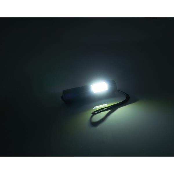 Plastikowa latarka COB, z dwoma trybami świecenia (zwykły i migający), latarka posiada focus, którym można regulować rozproszenie światła oraz dodtkową lampkę na rączce. Latarka ładowana jest na kabel USB-C, dołączony do zestawu.