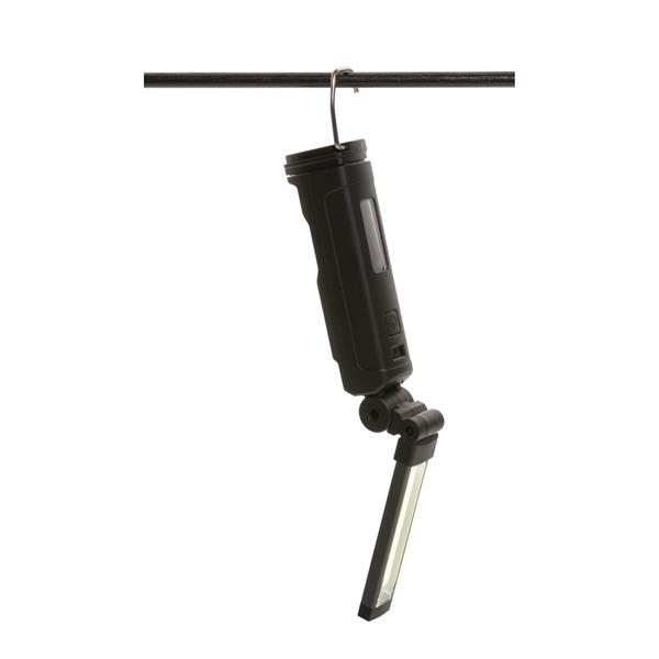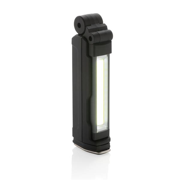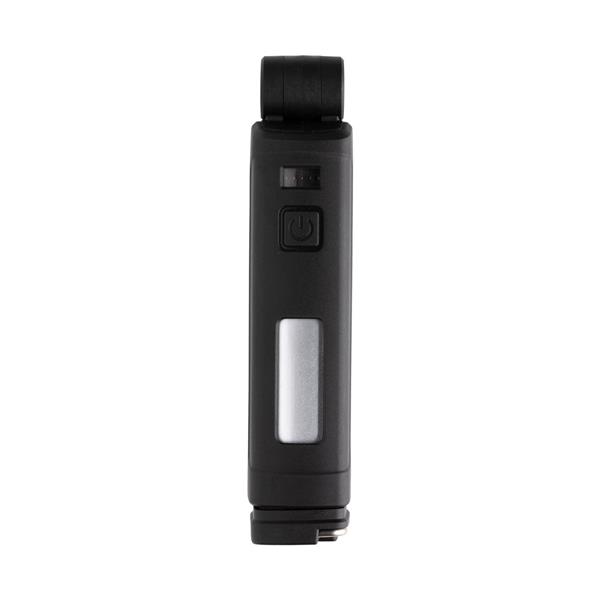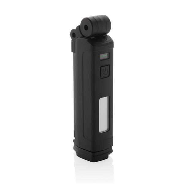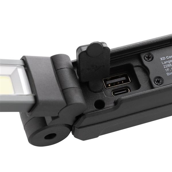 Latarka COB LED, jasność światła COB do 600 lumenów, LED do 200 lumenów, wykonana z materiałów z recyklingu, całkowita zawartość materiałów z recyklingu obliczona na podstawie wagi całkowitej przedmiotu: 25%, wbudowana bateria 2000 mAh, 6 trybów świecenia, wejście USB typu C, wyjście USB do ładowania urządzeń, czas świecenia na jednym ładowaniu do 3 godzin, ślad węglowy produktu: 0 kg CO2
