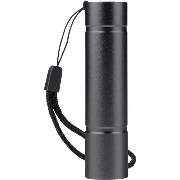 Latarka COB, 3 tryby świecenia, 80-100 lumenów, opaska na nadgarstek, ikona recyklingu na produkcie, funkcja ładowania, port USB-C, bateria 300 mAh, czarny kabel 30 cm w komplecie, zapakowana pojedynczo w brązowy kartonik, produkt wykonany z aluminium z recyklingu i poliestru