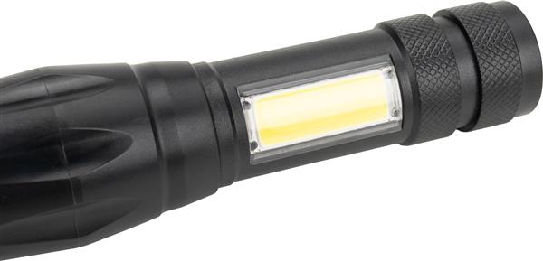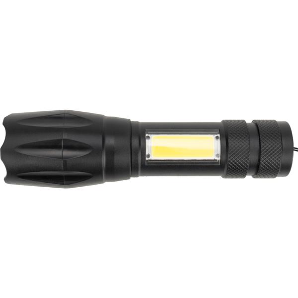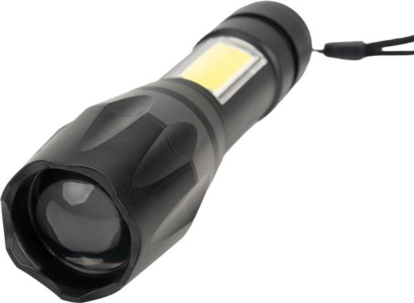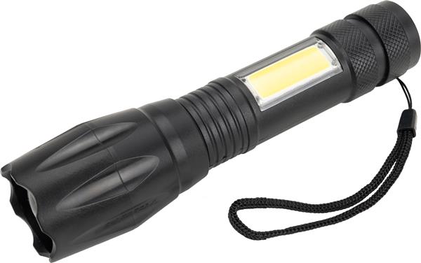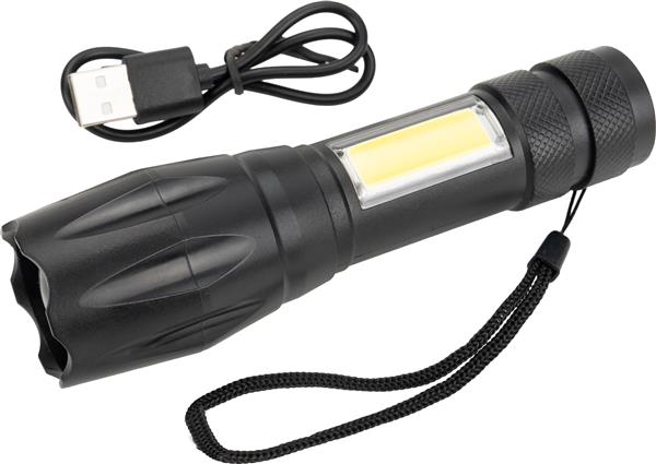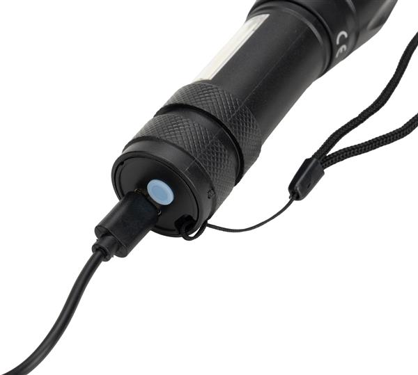Latarka z baterią o pojemności 600 mAh i diodą COB. Kabelek do ładowania w zestawie.