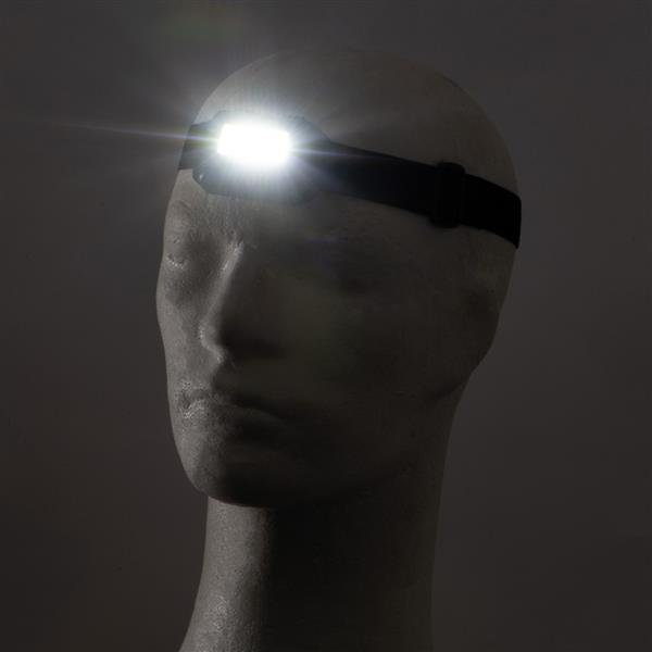 Plastikowa latarka COB na głowę z regulowanym, gumowym paskiem. Moc 3W. Wyposażona w 3 tryby świecenia (światło stałe, migające i przyciemniane). Dzięki stabilnej podstawie latarkę można też zdjąć z czoła i używać jak zwykłą lampkę.