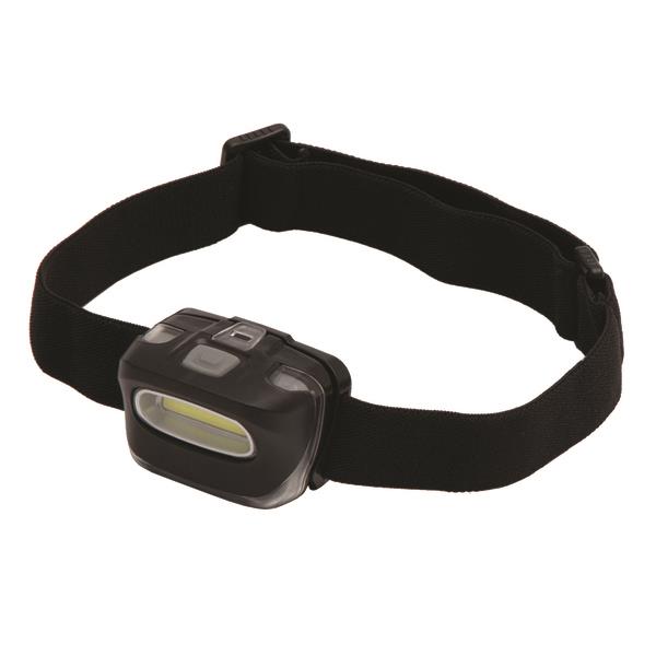 Latarka czołowa o strumieniu światła 100 lumenów. Dioda 3 W z wykorzystaniem technologii COB. Regulowany pasek na głowę/czapkę/kask. Regulowany kąt nachylenia latarki w zakresie 18-20 stopni. Zasilana 3 bateriami typu AAA (dołączone). Żywotność LED 100 000 godz. Zasięg 80 metrów.