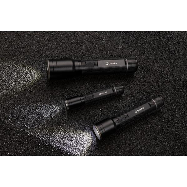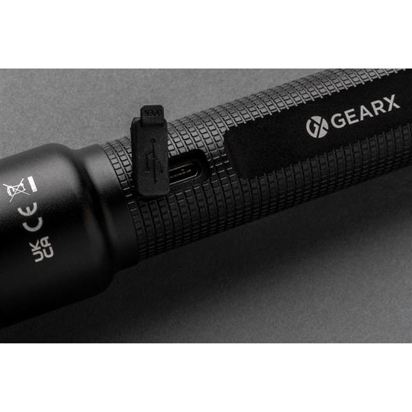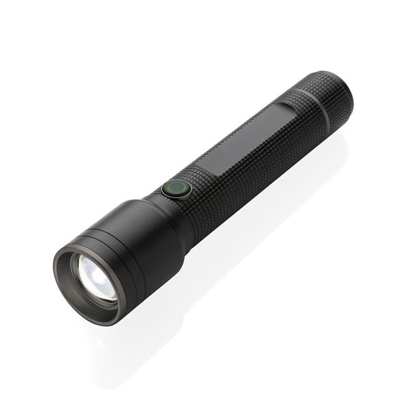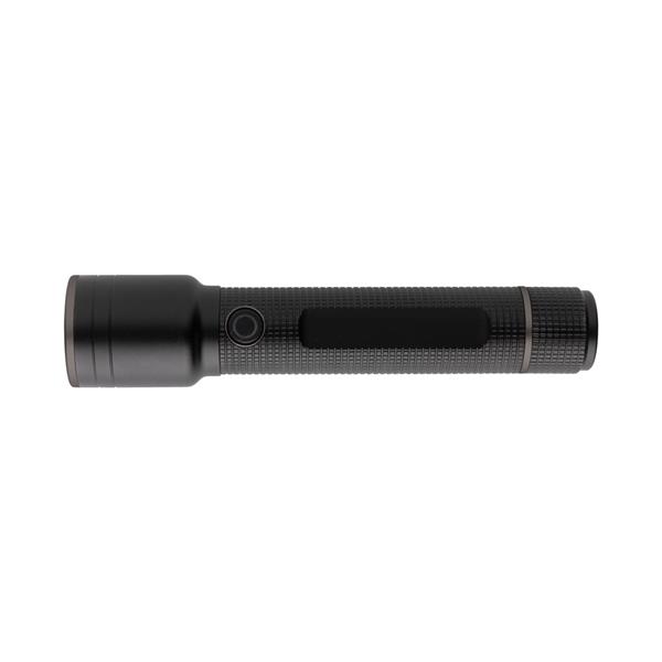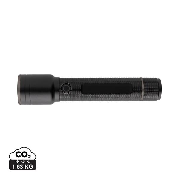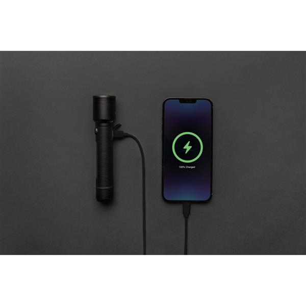 Latarka 10W o bardzo jasnym świetle, wodoodporna IP4, wiązka 800 lumenów sięgająca do 5000 m, wysokiej jakości żarówka z 5 trybami świecenia, w tym SOS, wbudowany akumulator 2000 mAh pozwala na około 8 godzin ciągłego świecenia, ładowana za pomocą USB, wykonana z aluminium z recyklingu z certyfikatem RCS, całkowita zawartość materiałów z recyklingu obliczona w oparciu o wagę całkowitą przedmiotu: 20%, w pudełku z papieru kraftowego