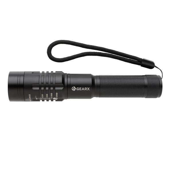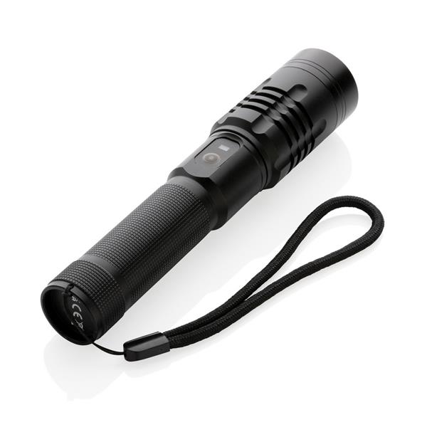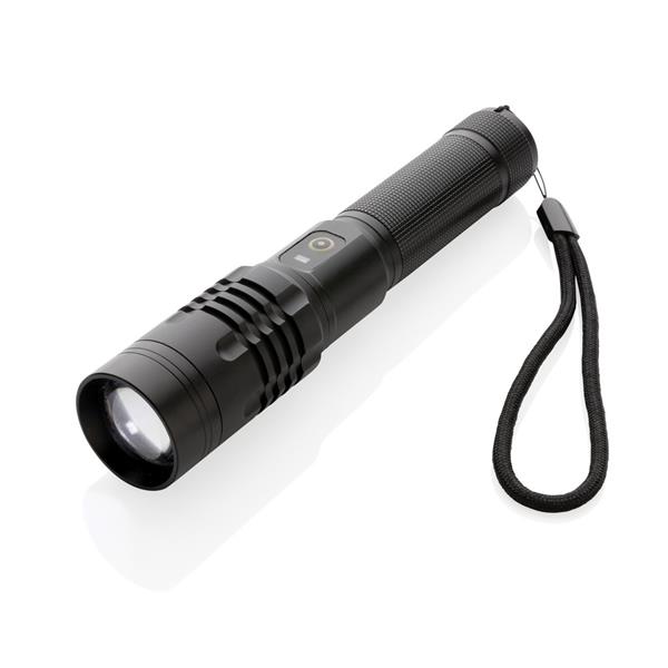 Latarka o bardzo jasnym świetle, wodoodporna IPX4 (całkowita ochrona przed spryskiwaniem i zachlapaniem wodą z różnych kierunków z natężeniem do 10 litrów na minutę), wiązka 1000 lumenów sięgająca do 500 m, wysokiej jakości żarówka z 5 trybami świecenia, w tym SOS, wbudowany akumulator 2000 mAh pozwala na około 4 godziny ciągłego świecenia, ładowana za pomocą USB, ślad węglowy produktu: 2,72 kg CO2