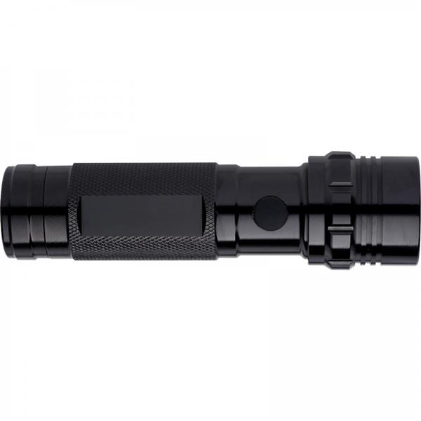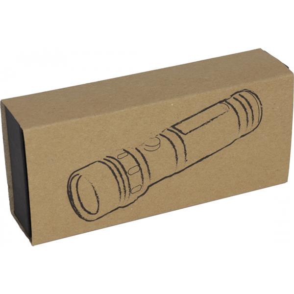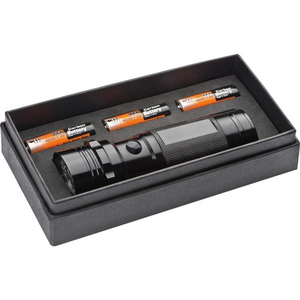 Metalowa latarka z 14 żarówkami LED. Dostarczana w kartonowym pudełku razem z bateriami 3xAAA.
