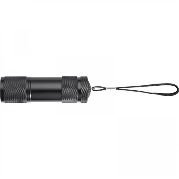 Latarka z 9 diodami LED dającymi bardzo jasne światło. Wykonana z aluminium i zapakowana wraz z trzema bateriami w kartonik.