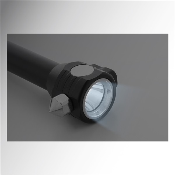 Latarka aluminiowa 3 w 1 z młotkiem ratunkowym i przecinakiem pasów bezpieczeństwa. Z wbudowaną baterią ładowalną przez USB (500 mAh), magnesem i paskiem do noszenia. Z mocnym światłem COB z przodu i reflektorem COB z boku. W zestawie kabel do ładowania USB.