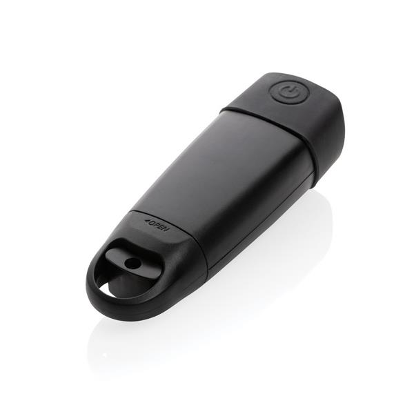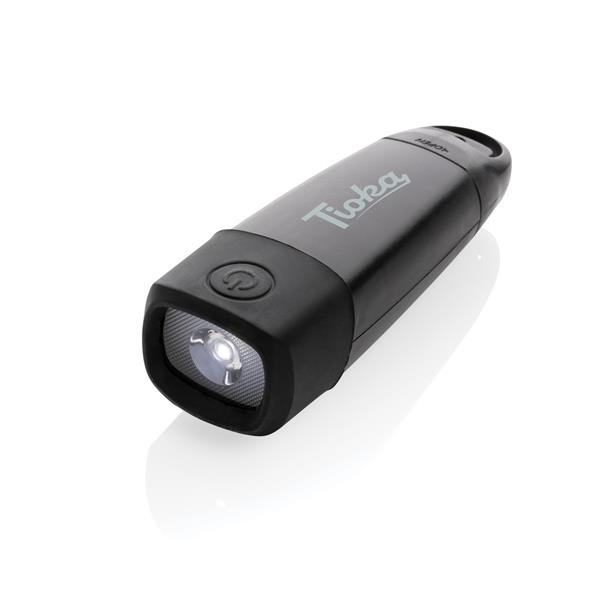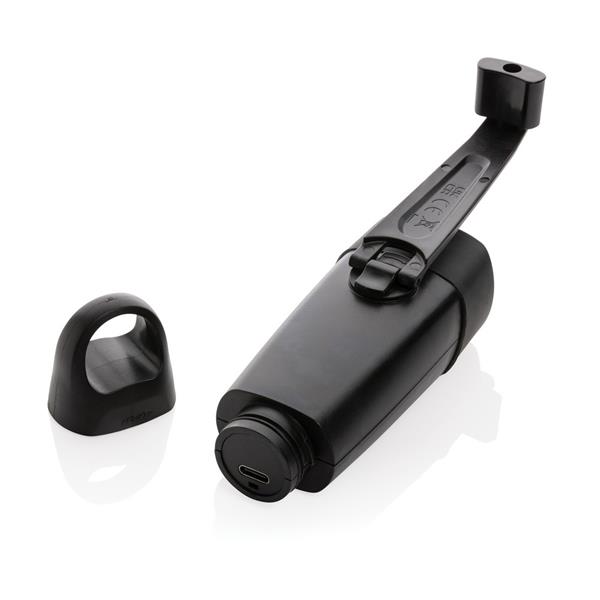 Latarka LED z dynamo, moc 120 lumenów, wbudowany akumulator o pojemności 620 mAh pozwala na świecenie do 2 godzin na jednym ładowaniu, wejście USB typu C, wykonana z ABS z recyklingu z certyfikatem RCS, całkowita zawartość materiałów obliczona na podstawie wagi całkowitej przedmiotu: 30%, ślad węglowy produktu: 0 kg CO2