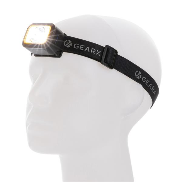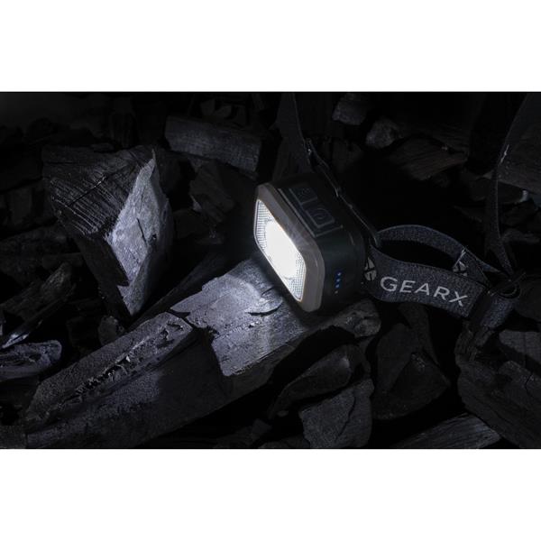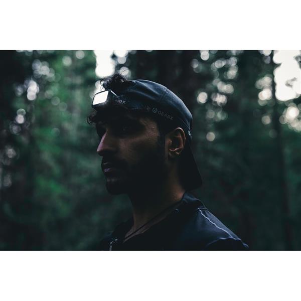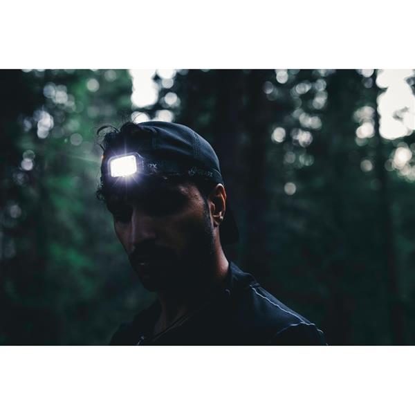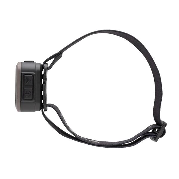 Latarka na głowę COB LED, jasność do 250 lumenów, długość wiązki światła do 70 metrów, wykonana z materiałów z recyklingu, całkowita zawartość materiałów z recyklingu obliczona na podstawie wagi całkowitej przedmiotu: 23%, regulowana wielkość, wbudowana bateria 800 mAh, 6 trybów świecenia, wejście USB typu C