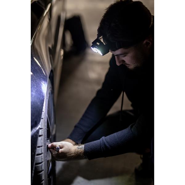 Latarka na głowę ze światłem LED i COB, możliwość korzystania z obu rodzajów oświetlenia jednocześnie, 1x LED (max. 50 m, ok. 80 lumenów), 2x COB (max. 10 m, ok. 100 lumenów), przycisk ON/OFF, wejście USB-C, wejście 5V/500 mA, 4 tryby świecenia, ok. 2,5h pracy na jednym naładowaniu, regulacja kierunku światła, wodoodporna IPX5, ładowana przez USB, kabel USB-C w komplecie