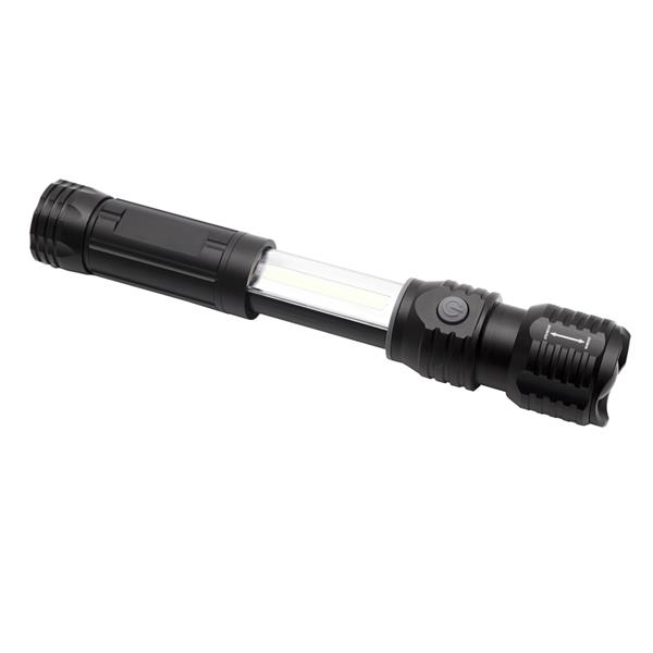 Doskonała latarka dla wymagających o strumieniu światła 250 lumenów i zasięgu 200 metrów, dioda CREE XPG (5 W). Wyposażona w wysuwany panel roboczy zasilany 16 diodami COB (3W) 160 lumenów o żywotności 100 000 godzin. Magnes umieszczony u podstawy. Funkcja zoom. Nylonowe etui. Zasilana 4 bateriami AAA (dołączone). Pakowana w upominkowe opakowanie.