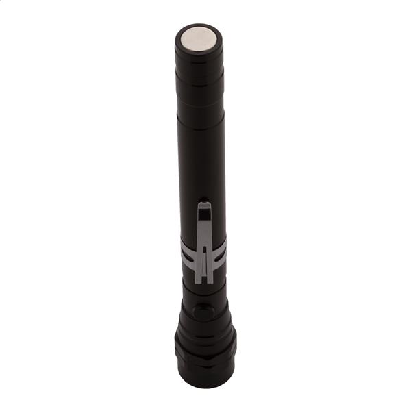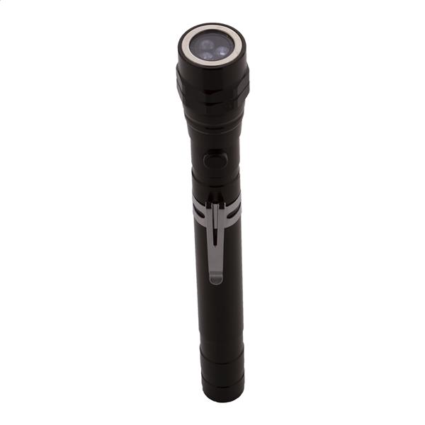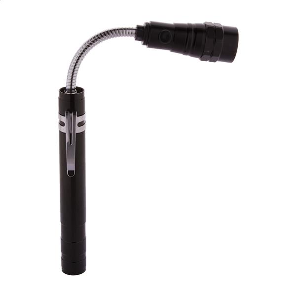 Aluminiowa latarka na 3 diody LED z wysuwaną i elastyczną głowicą, magnesem na górze i metalowym klipsem bocznym. Zawiera baterie guzikowe. Maks. długość: 57 cm.